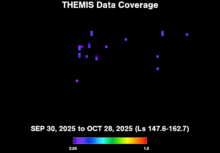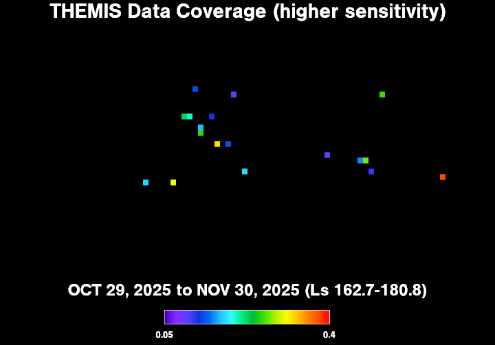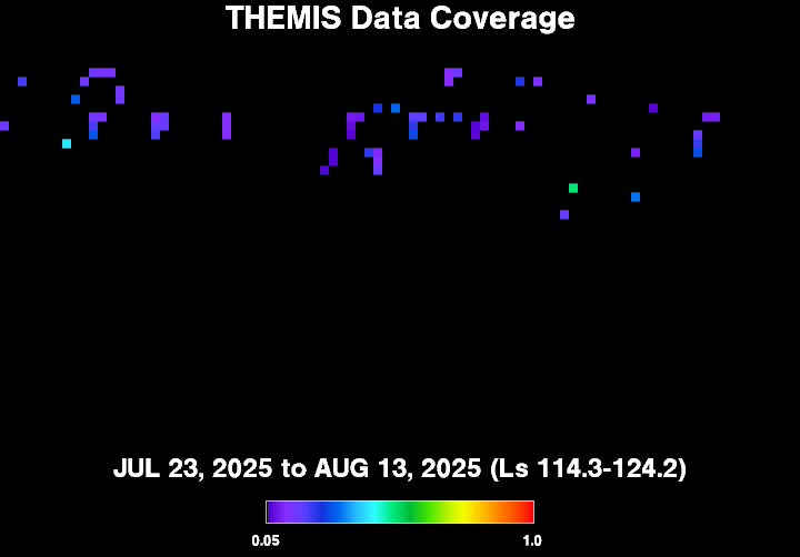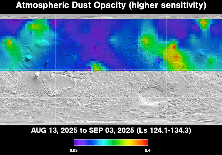 The Thermal Emission Imaging System (THEMIS) on NASA's Mars Odyssey orbiter is monitoring dust activity in the Martian atmosphere. The maps below go back to orbit 24400 (June 15, 2007). They show atmospheric opacity due to dust at an infrared wavelength of 9 micrometers. New maps are generated approximately every week, as data are received and spacecraft operations permit.
